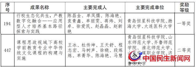 近日,山東省教育廳公布了第九屆教學(xué)成果獎(高等教育類)獲獎名單,青島恒星科技學(xué)院兩項成果獲得省級高等教育教學(xué)成果獎。其中,由董事長陳昌金教授主持的《行校生態(tài)化共生,產(chǎn)教數(shù)字化融合——應(yīng)用型人才培養(yǎng)基本路徑探索與實踐》獲得山東省教學(xué)成果獎一等獎;王冰教授主持的《課程思政視域下高校學(xué)前教育專業(yè)中華傳統(tǒng)文化課程的構(gòu)建與實施》獲得山東省教學(xué)成果獎二等獎,是學(xué)校教學(xué)成果獎質(zhì)量的一次重大提升。