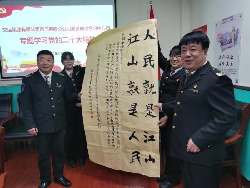11月25日下午,青島城運控股交運集團萊西事業(yè)部黨委理論中心組2022年第十一次學(xué)習(xí)在總部四樓黨員活動室舉行,交運集團列席旁聽工作組第一組組長、文化宣傳部部長劉增平及成員青島汽車總站文化宣傳處處長郭曉、溫馨巴士文化宣傳處處長任慧平列席,劉增平部長最后作了點評,并現(xiàn)場贈送書法“人民就是江山,江山就是人民”。