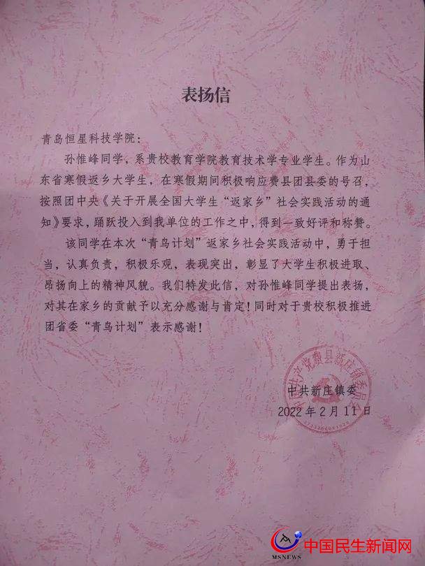 教育學(xué)院19級(jí)孫惟峰同學(xué)在寒假期間積極響應(yīng)國家疫情防控的號(hào)召,中共新莊鎮(zhèn)委來信表達(dá)對(duì)他工作踏實(shí)肯干、認(rèn)真負(fù)責(zé)的認(rèn)可。