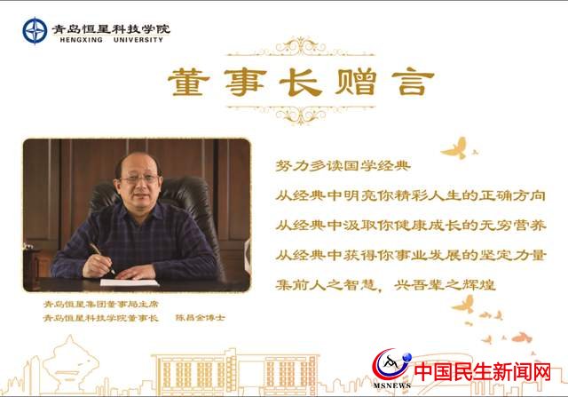 青島恒星科技學(xué)院在剛剛結(jié)束的2022年畢業(yè)典禮上,恒星董事長(zhǎng)陳昌金即興發(fā)言,他寄語恒星畢業(yè)學(xué)子,要努力多讀國(guó)學(xué)經(jīng)典,遵行“文明、博學(xué)、實(shí)踐、創(chuàng)新”的校訓(xùn),集古人之智慧,興吾輩之輝煌。