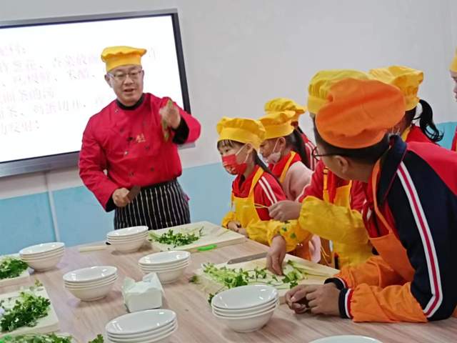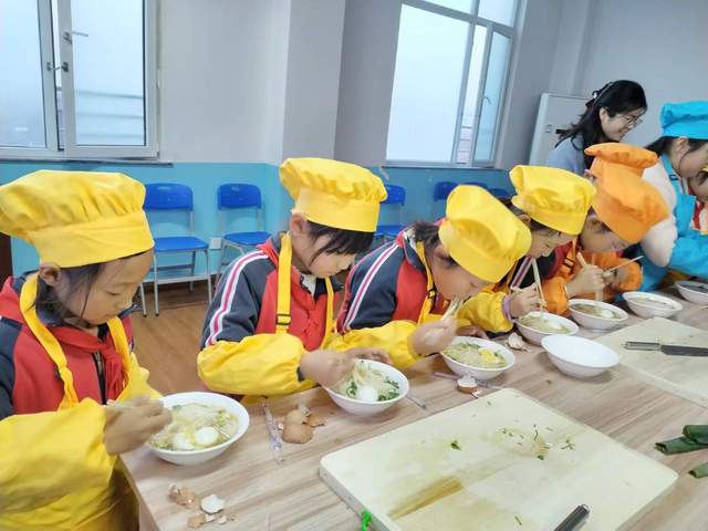 接下來,校長(zhǎng)從握刀、切菜到煮面的火候、時(shí)長(zhǎng)再到調(diào)料的搭配,每一個(gè)環(huán)節(jié)都耐心地講解,手把手地示范著。孩子們專心地聽講,認(rèn)真地練習(xí),從一開始的小心翼翼到后來的熟練操作,在練習(xí)中樹立了信心。