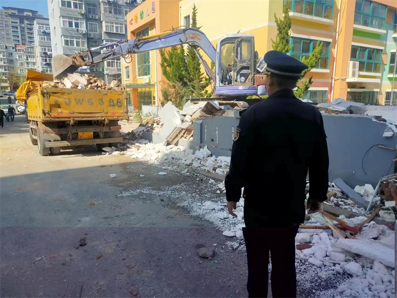 夾嶺溝小區(qū)內(nèi)之前有一處830平的違章建筑,內(nèi)部劃分為17個(gè)房間,不僅影響小區(qū)的環(huán)境,而且使公共區(qū)域顯得十分擁擠。原是開發(fā)小區(qū)時(shí)的臨建工棚,小區(qū)建成后,該建筑作為物業(yè)公司、社區(qū)和小區(qū)業(yè)主委會(huì)的辦公用房,雖然多次進(jìn)行修繕,但始終影響小區(qū)整體環(huán)境。中隊(duì)執(zhí)法人員了解情況后,主動(dòng)對(duì)接規(guī)劃部門查找規(guī)劃手續(xù),聯(lián)系原開發(fā)商和房屋使用方并對(duì)其進(jìn)行法律宣傳,張貼拆除違建通知。通過(guò)不懈努力,最終做通各方思想工作,房屋使用方也積極配合騰空了房間內(nèi)物品,主動(dòng)支持違建拆除工作。由于此處違建在居民區(qū)內(nèi),且面積較大,存在一定施工難度,需大型工程機(jī)械拆違施工。在小區(qū)業(yè)主委員會(huì)積極開展清空小區(qū)道路上的停放車輛等拆違準(zhǔn)備工作后,4月底,合肥路街道綜合行政執(zhí)法中隊(duì)組織拆違公司入場(chǎng)進(jìn)行違建拆除,同時(shí),為了盡最大可能降低揚(yáng)塵對(duì)小區(qū)居民的影響,拆違過(guò)程采取高壓灑水降塵,拆除違建后,又將建筑廢棄物全部清理干凈,共清理建筑廢棄物48車次。