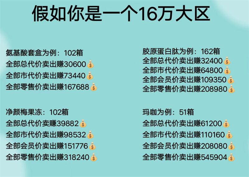 據(jù)經(jīng)銷商介紹,若自己是大區(qū),招到大區(qū),公司就會(huì)下發(fā)平級(jí)返利,不同產(chǎn)品的平級(jí)返利補(bǔ)貼也有所不同。比如蛹蟲草瑪咖片,一盒返利10塊錢,如果自己推薦的大區(qū)拿了一萬(wàn)盒的瑪咖片,自己能拿到的平級(jí)返利就是十萬(wàn)元;再比如縱美水光霜,一盒該產(chǎn)品的平級(jí)返利為5塊錢。