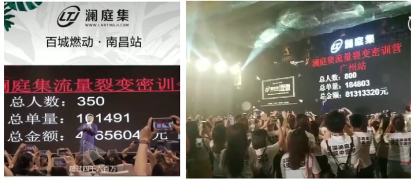 回首最近幾年,瀾庭集在推廣市場(chǎng)這一層面已經(jīng)達(dá)到了相當(dāng)火爆的程度,據(jù)公開資料顯示,在2018年開展的團(tuán)隊(duì)精英裂變密訓(xùn)會(huì)上,瀾庭集的經(jīng)銷商們就拿到了不俗的業(yè)績(jī)。比如南昌站,兩天的時(shí)間內(nèi),350人就創(chuàng)造了四千六百萬(wàn)的成交額;又比如廣州站,該站再創(chuàng)新高,800人成交了八千多萬(wàn)的業(yè)績(jī)。