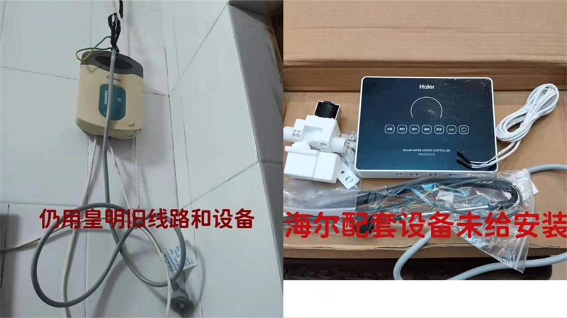 主要原因是海爾集團(tuán)派來無資質(zhì)蹩腳的安裝工,圖省事偷工減料,違規(guī)操作,不顧我們用戶的堅(jiān)決反對(duì),執(zhí)意使用15年前我們就開始使用的已老化了的皇明太陽能熱水器的舊控制系統(tǒng),隨機(jī)匹配的海爾太陽能新配套設(shè)備省下想帶走(見下圖),