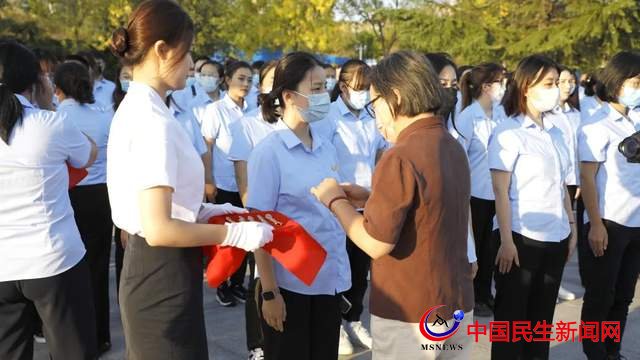 隨后,出席此次活動的領(lǐng)導(dǎo),滿含深情的逐一為每名新教師佩戴上金光閃閃的?;铡?/span>