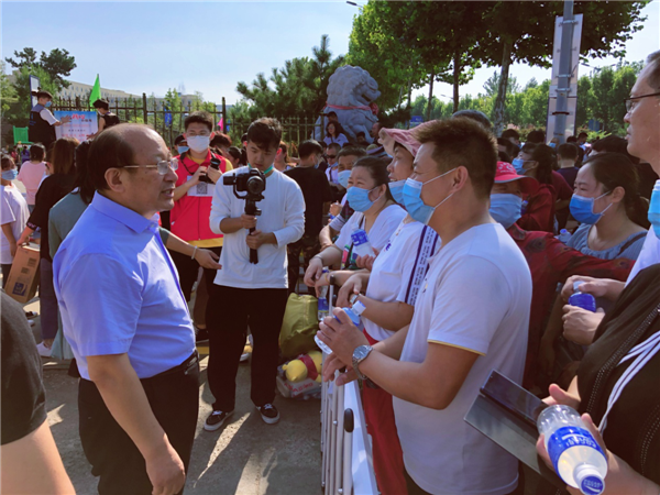 (青島恒星科技學院董事長、校長陳昌金博士親臨迎新現(xiàn)場與學生家長親切交流)