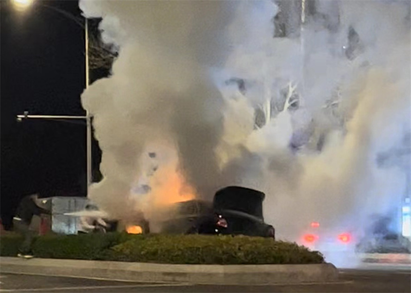 膠州一黑色“凱美瑞”轎車沖進綠化帶 隨后發(fā)生自燃