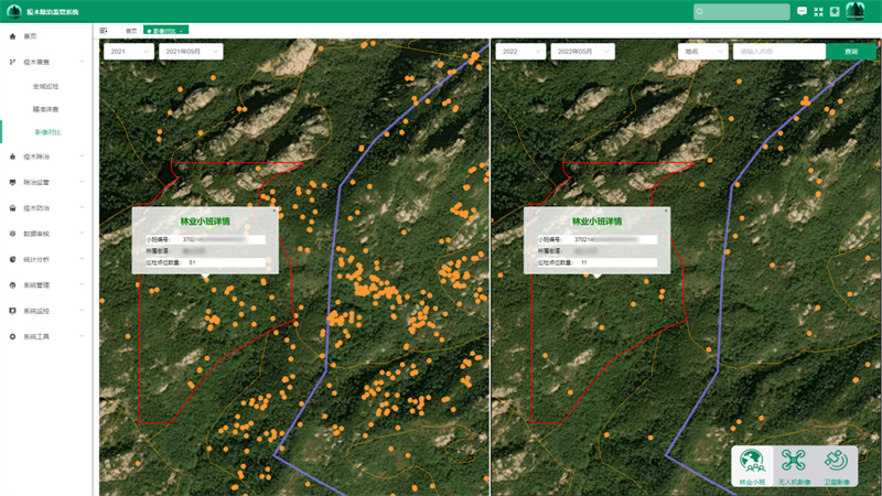 精準(zhǔn)監(jiān)管。依托航空航天專(zhuān)用AI中臺(tái)技術(shù),自主打造松材線蟲(chóng)病空天地一體化智能監(jiān)管平臺(tái)和疫木除治信息采集APP,實(shí)現(xiàn)松材線蟲(chóng)病防控工作從疫木普查、疫木除治、除治監(jiān)管、成效核查、檔案管理的全流程、閉環(huán)式實(shí)時(shí)在線監(jiān)管。