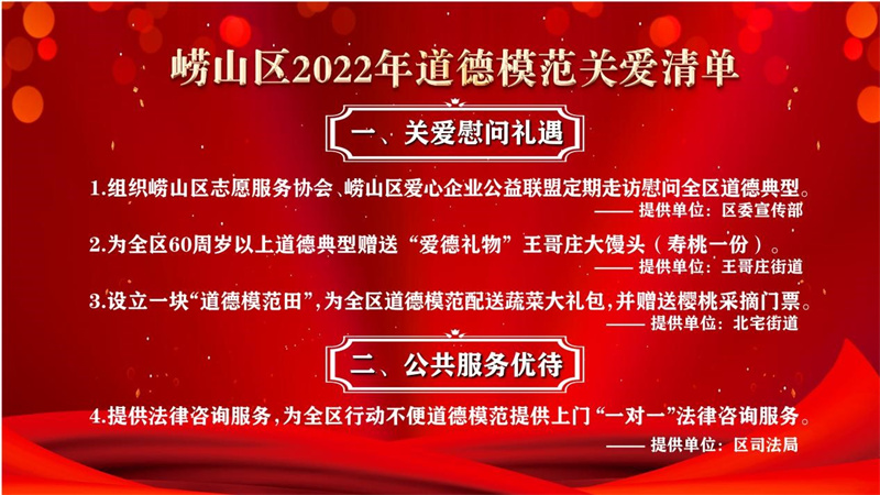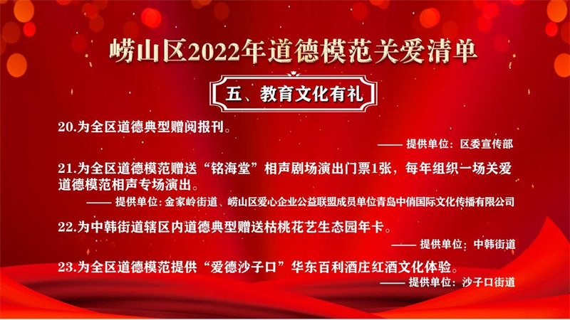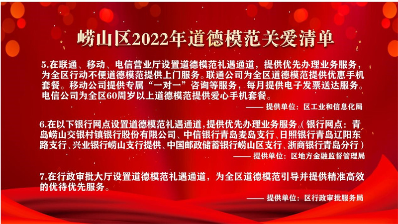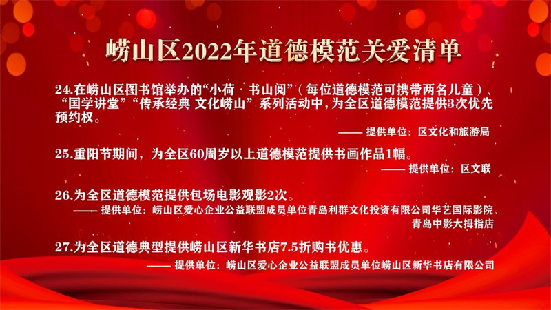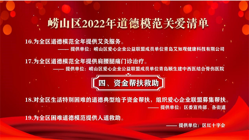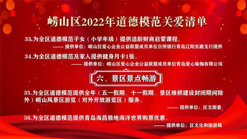 今年,嶗山區(qū)匯聚來自全區(qū)各街道、各部門、各單位、眾多愛心企業(yè)關愛聯(lián)盟成員企業(yè)的善行義舉,最終確定走訪慰問、公共服務、醫(yī)療服務、資金幫扶、教育文化和游覽景點等六大板塊、總計36項道德模范關愛舉措。2022年5月1日起,嶗山區(qū)將集中開展“道德模范關愛月”活動,道德模范可憑“嶗·好人卡”享受各項關愛服務,在全社會進一步形成尊重、關愛、禮遇道德模范的濃厚氛圍,樹立崇德尚禮、見賢思齊的價值導向。