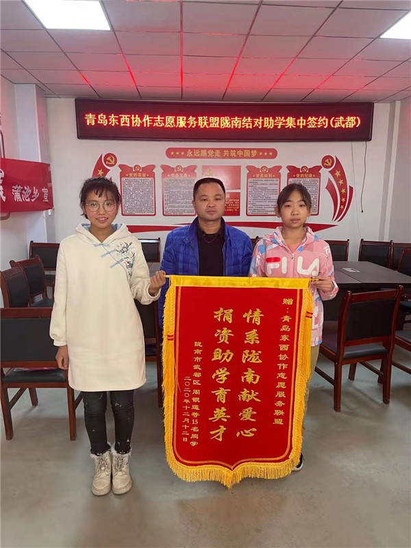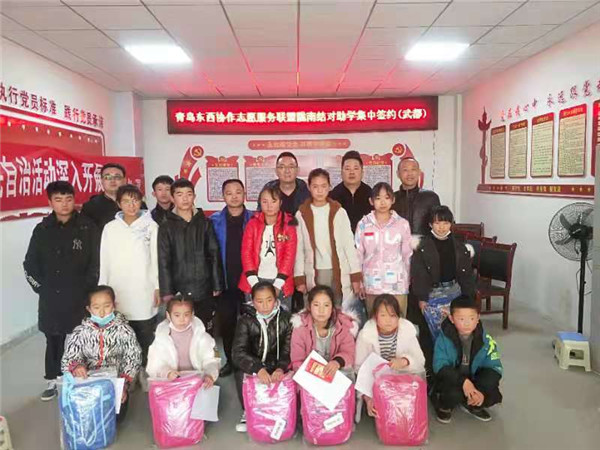 青島(東部)志愿服務(wù)聯(lián)盟是由青島、濟(jì)南、威海、北京、江蘇、上海等地的愛(ài)心人士和威海商會(huì)、徐州商會(huì)、泰萊農(nóng)業(yè)、富德人壽等商會(huì)、高校和企業(yè),自發(fā)、自愿組成的助學(xué)志愿者互助組織,有的資助者是多人(三人)幫一人,有的是一人幫多人。(匿名資助者馬先生一人幫十人)。劉云霞、李莉婷、于子晴分別動(dòng)員家人結(jié)親資助了3-5個(gè)隴南孩子。