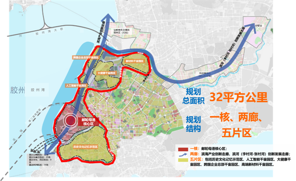這一區(qū)域位于膠州灣東岸。面向膠州灣,區(qū)域的邊界因此也將膠州灣一代升級成山東開放發(fā)展潮頭的“黃金海岸”,區(qū)域自身而言也正好形成與日韓交流合作的一個突破口。