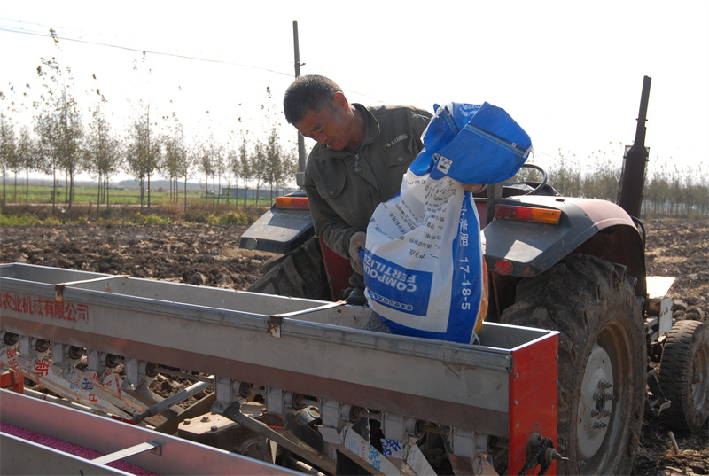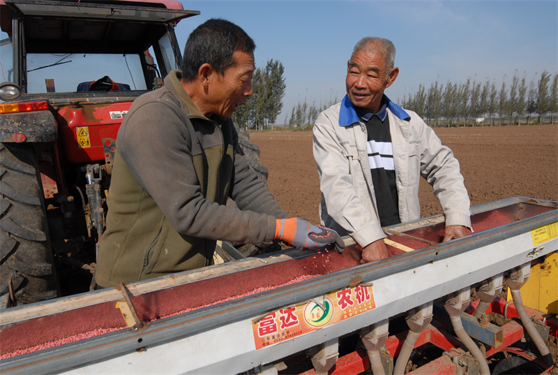 10月18日,在即墨區(qū)段泊嵐鎮(zhèn)東瓦三村的土地里,機(jī)器聲隆隆作響,一粒粒麥種隨著播種機(jī)的上下翻動(dòng)被播進(jìn)土里,農(nóng)民于成愛坐在地頭一邊準(zhǔn)備著種子肥料,一邊查看播種情況。