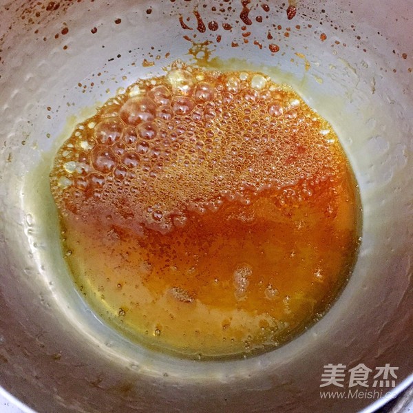 1.將糖與適量熱水加入湯鍋加熱煮沸,轉(zhuǎn)中小火,繼續(xù)加熱。氣泡由多變少,糖液變粘稠