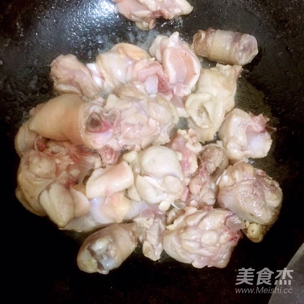 5.鍋內(nèi)下油,油熱下雞塊翻炒。