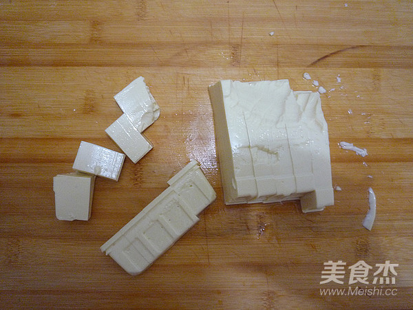 3.腌漬蝦仁和雞片的時候來處理嫩豆腐,嫩豆腐取出切塊