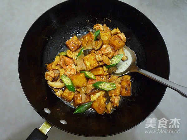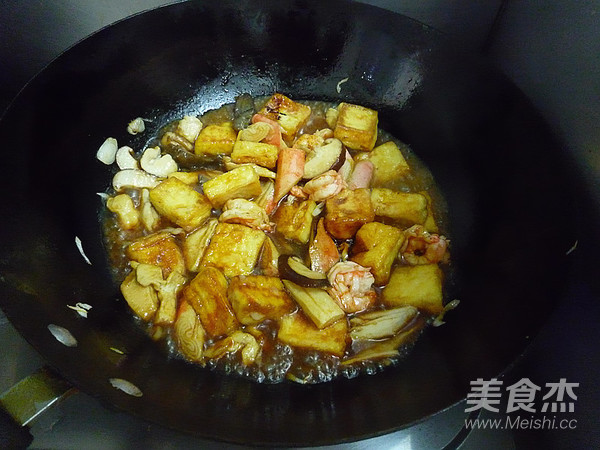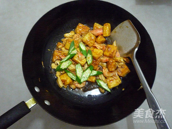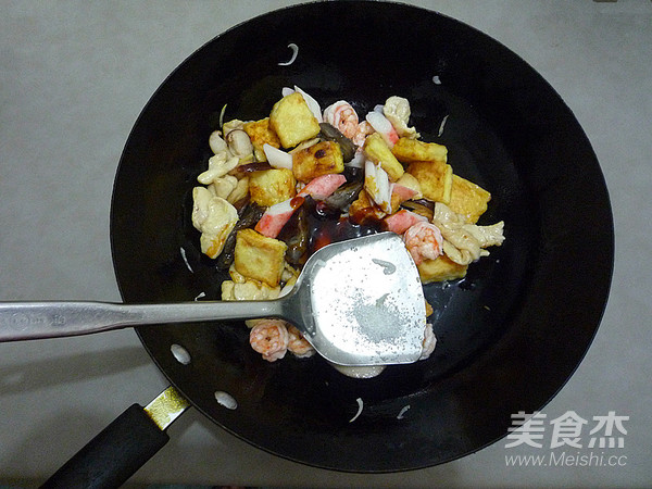 10.炒出香味后,放入炸好的豆腐、滑炒好的雞肉、焯過水的海參、蝦仁、蟹肉棒等食材。
