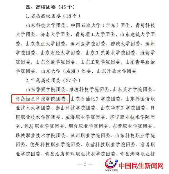 青島快訊 近日,青島恒星科技學(xué)院收到來(lái)自共青團(tuán)山東省委的表?yè)P(yáng)信,表?yè)P(yáng)他們?cè)?021年度“青年大學(xué)習(xí)”網(wǎng)上主題團(tuán)課過(guò)程中,校團(tuán)委及各團(tuán)總支積極組織,學(xué)校團(tuán)員及青年積極參與,全年參學(xué)率達(dá)100%,位列團(tuán)關(guān)系隸屬市級(jí)團(tuán)組織高校第41位,因而被團(tuán)省委點(diǎn)名表?yè)P(yáng)。