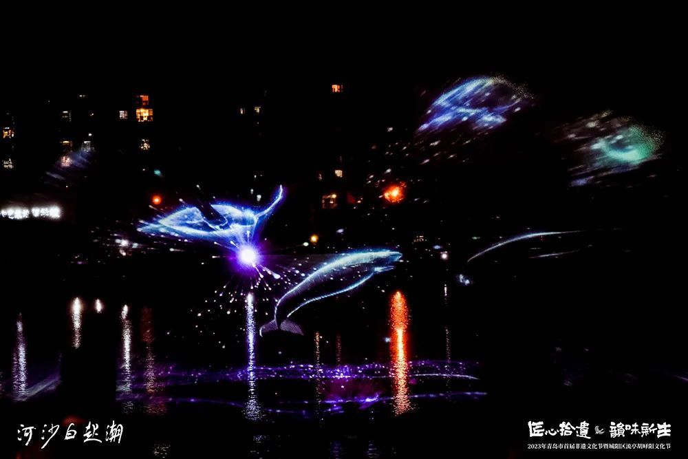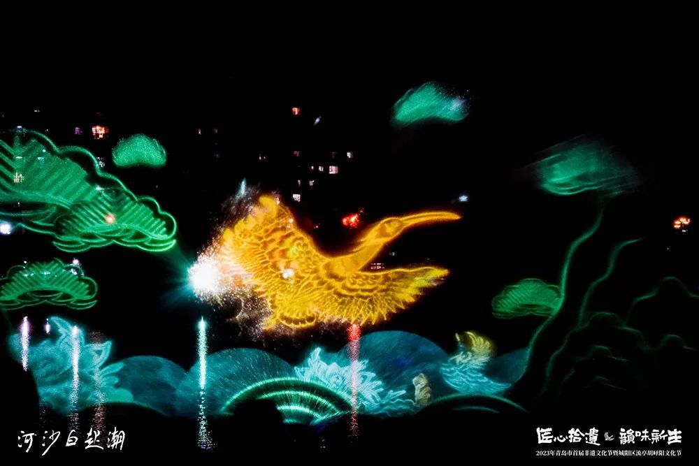 尤其顛覆想象的是,在非遺水陸光影秀《潮起白沙河》中,“非遺+藝術+科技”的組合模式,令人耳目一新,流連忘返——朱鹮、白鷺、文鰩魚、山、海、云、傳統(tǒng)書法等元素通過水幕光影的形式,為大眾營造出超酷炫的夢幻空間。