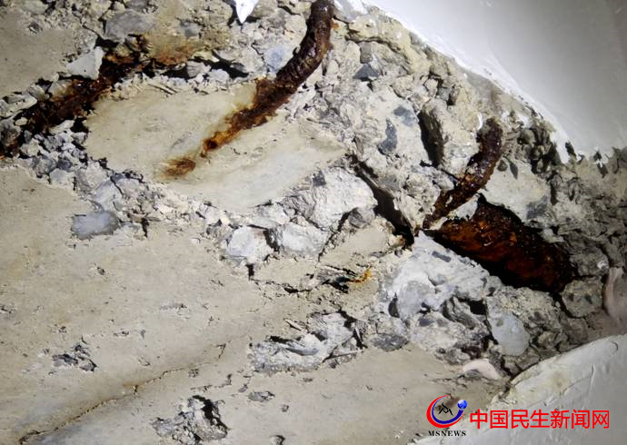 修復(fù)的承重橫梁和剪力墻裸露著鋼筋,水泥明顯空鼓