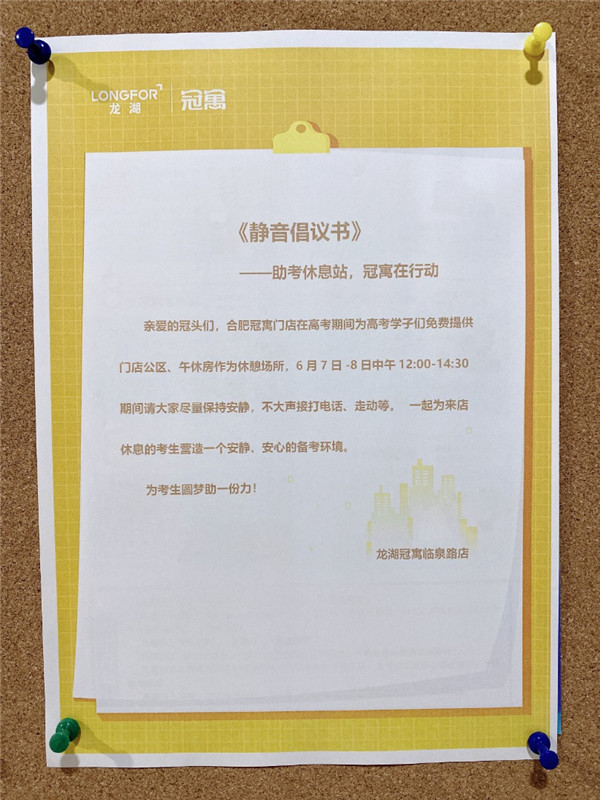 值得注意的是,冠寓在每個門店都公示了一張“靜音倡議書”。門店運營官解釋道:“這是全國冠寓門店統(tǒng)一的服務動作,除我們自己的工作人員嚴格遵守外,還會通過線上線下的方式向門店租戶發(fā)起倡議——高考期間盡量保持安靜,不大聲接打電話、走動等,幫來店休息的考生營造一個安靜、安心的備考環(huán)境,為考生圓夢助一份力。”