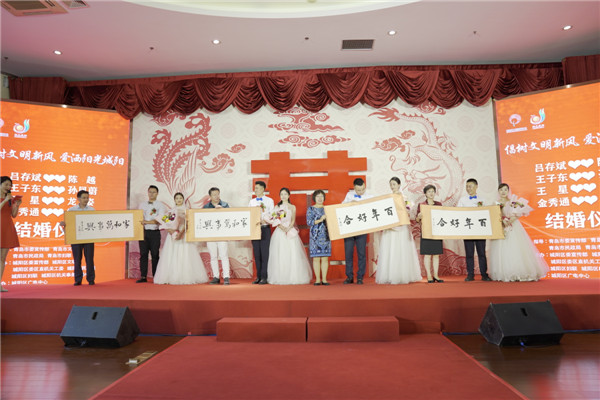 在城陽街道大北曲后社區(qū)民樂團志愿者演奏的《喜洋洋》等傳統(tǒng)民樂的暖場下,婚姻輔導(dǎo)師——全國最美家庭代表紀(jì)燕為新人婚前講“家”,幫助新人更好地認識和理解婚姻生活。城陽區(qū)民政局局長孫勛先為新人們頒發(fā)結(jié)婚證,區(qū)政府副區(qū)長呂永翠致證婚辭,道德模范代表、中國好人徐立強為新人們送上珍稀植物——山丹百合,市文明辦、市民政局、市婦聯(lián)領(lǐng)導(dǎo)和區(qū)政府副區(qū)長呂永翠分別向4對新人贈送了婚姻箴言書法作品。伴隨著獨唱節(jié)目《陽光家風(fēng)代代傳》、小提琴演奏、快閃《我和我的祖國》,現(xiàn)場的氣氛熱烈而喜慶。儀式最后,新人們與嘉賓、親朋到臺上合影留念,記錄4對新人最美好的時刻。