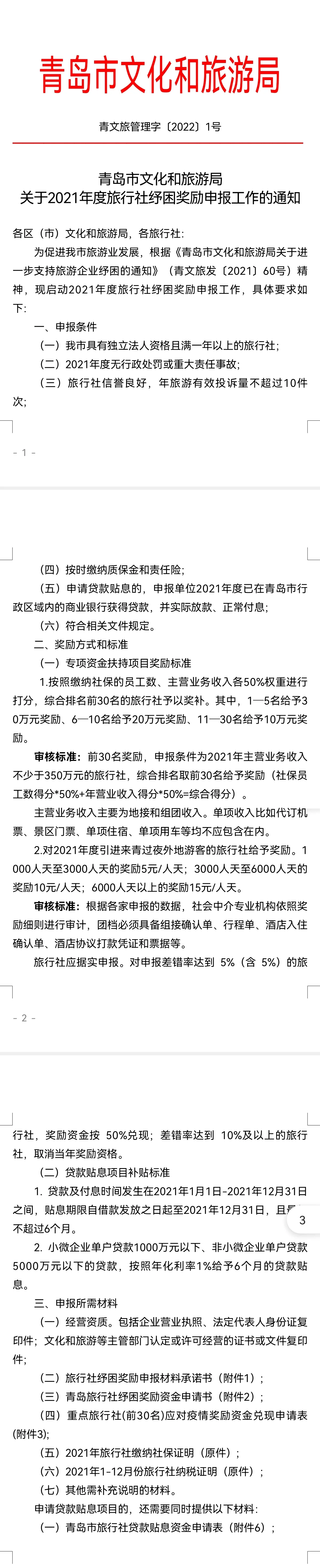 據(jù)網(wǎng)絡(luò)媒體報道:青島市文旅局本年初印發(fā)關(guān)于支持旅游企業(yè)紓困的通知,設(shè)立專項紓困資金,最高獎勵30萬元來幫助旅游企業(yè)渡過難關(guān),推動旅游業(yè)恢復發(fā)展。