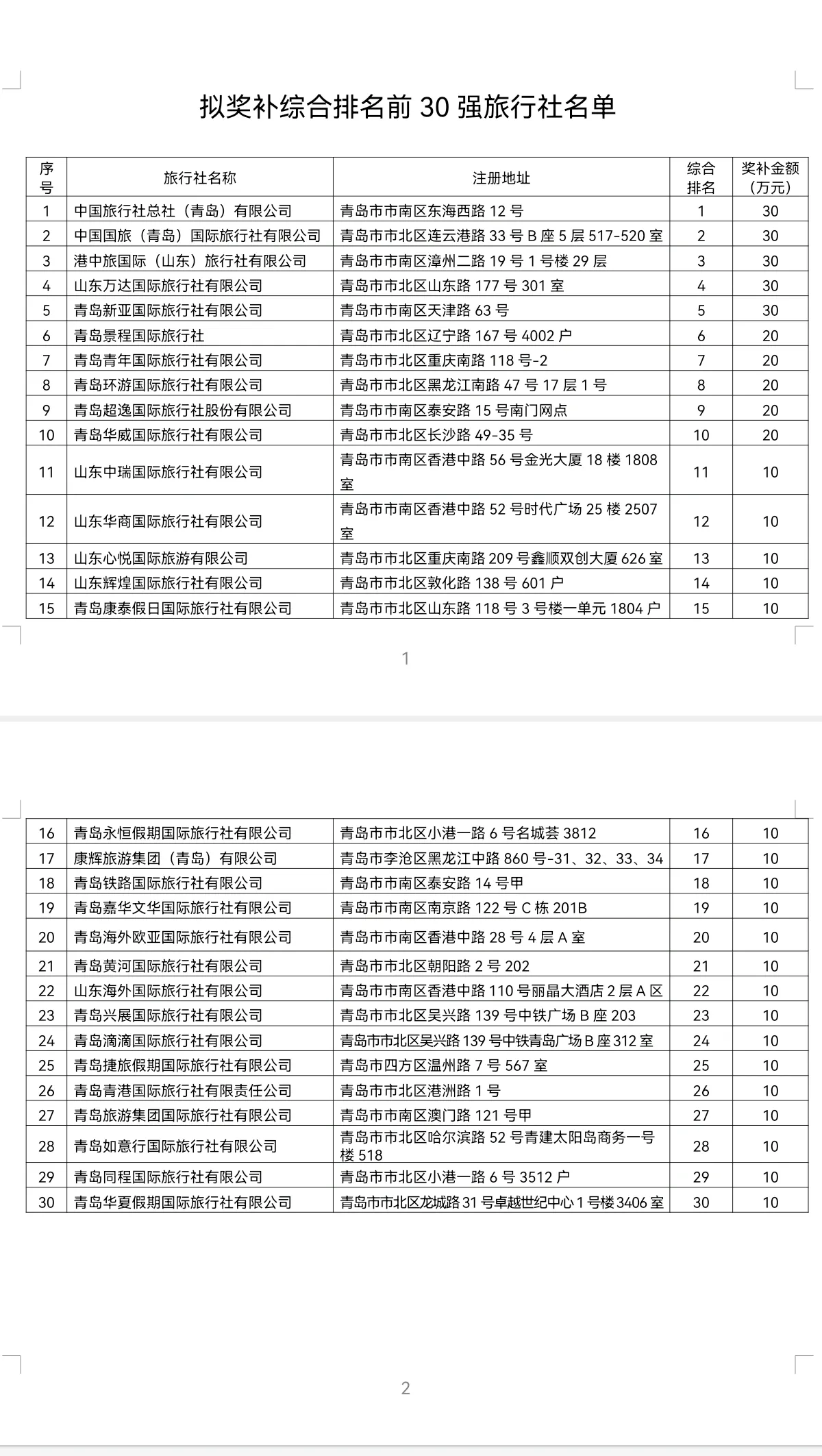 1、綜合排名前30名的旅行社予以獎補。其中,1─5名給予30萬元獎勵、6─10名給予20萬元獎勵、11─30名給予10萬元獎勵。