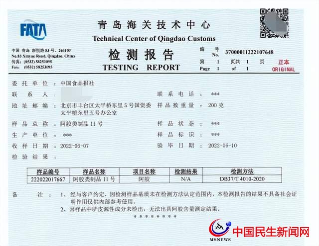 標(biāo)稱安徽譽(yù)藥堂藥業(yè)有限公司生產(chǎn)的一批次“亳春堂阿膠八珍膏”(生產(chǎn)日期:2022.04.10),經(jīng)檢測(cè)未檢出驢皮源性成分。