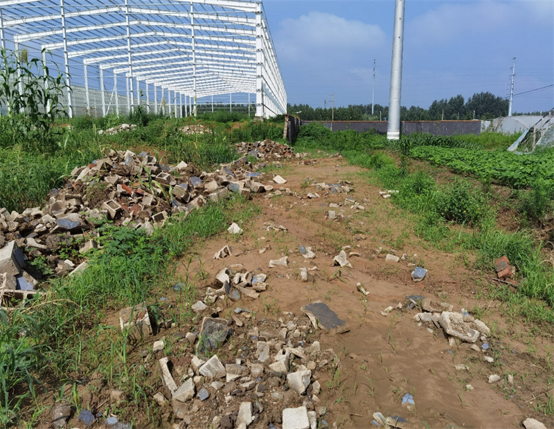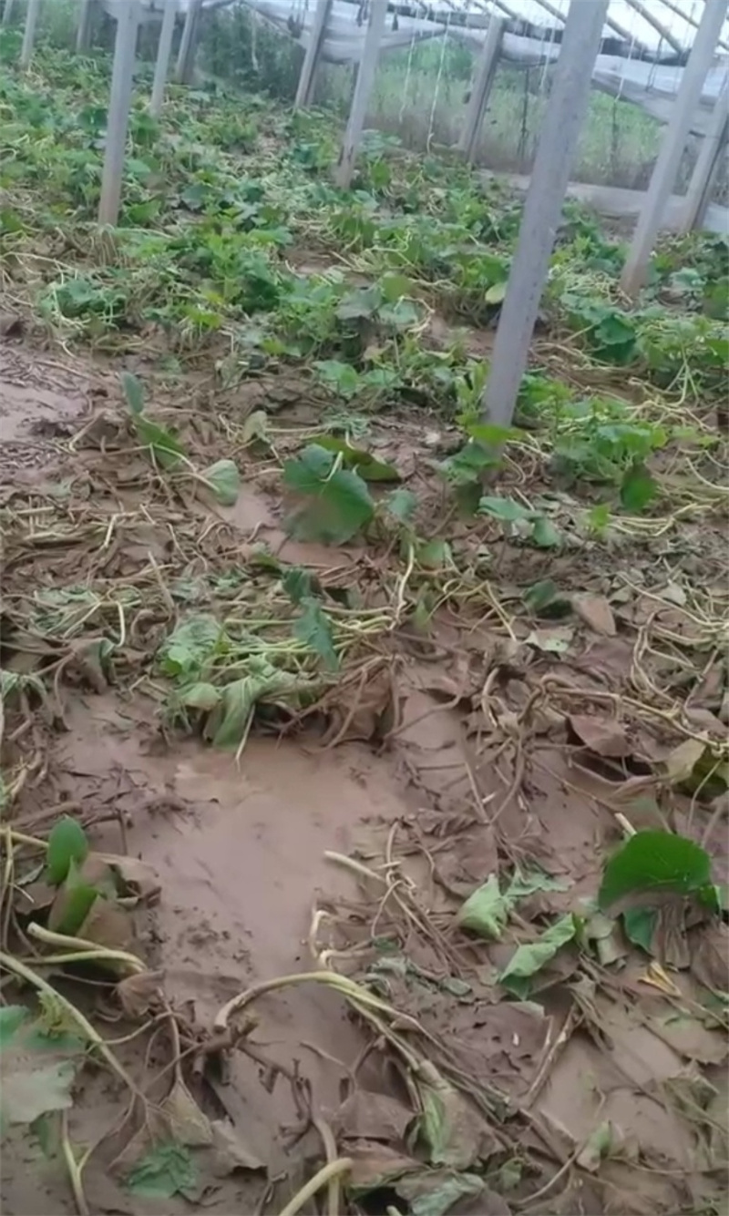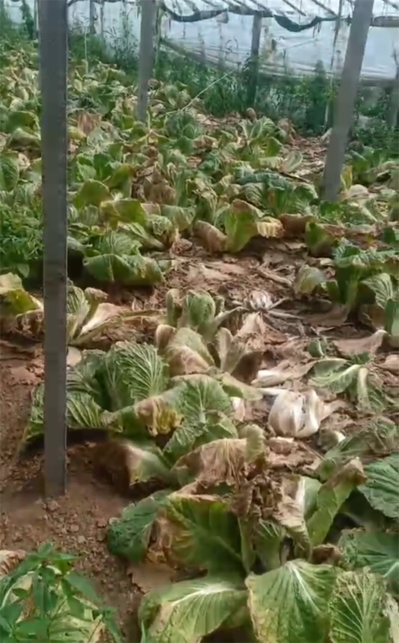 牟先生領(lǐng)著調(diào)查員來到大棚南頭看到南鄰是一個占地200多畝的大院子,里面有好幾座大型鋼構(gòu)廠房,院墻有兩處約50米左右的墻體被水沖垮。廠房地基比北面大棚高出2—3米左右,200多畝地的廠房內(nèi)沒有排水系統(tǒng),而且四周全是封閉式墻體跟大門,六月底連日降雨積攢了大量的雨水全部流到了廠房北側(cè)地勢低洼處,墻體承受不住導(dǎo)致倒塌,院內(nèi)200多畝廠房內(nèi)幾天的積水傾瀉而出涌入了牟先生的大棚內(nèi)。導(dǎo)致牟先生種了10個大棚的白菜、6個大棚的貝貝南瓜被淹,現(xiàn)在46畝白菜全部腐爛,貝貝南瓜搶救了部分,十存一二。本來預(yù)訂好白菜的客戶看到白菜被水淹了以后,告訴牟先生這些被水淹的白菜不要了,因為水淹白菜等不到運輸出去里面就開始腐爛。牟先生說這次損失大約在70~80萬左右。