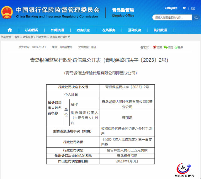 因違規(guī)收取保險(xiǎn)代理合同約定之外的手續(xù)費(fèi),青島銀保監(jiān)局對(duì)青島誠信達(dá)保險(xiǎn)代理有限公司即墨分公司及其法定代表人聶麗娟給予警告并罰款。