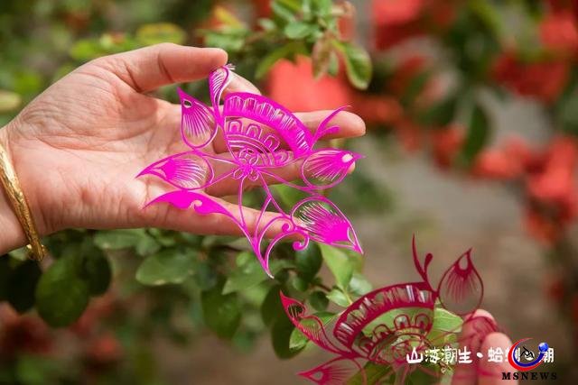 紅島喜盒子制作技藝傳承人郝青青創(chuàng)作的剪紙作品,紅島的地形猶盛開的蓮花,結(jié)合蛤蜊的造型,寓意吉祥喜樂。