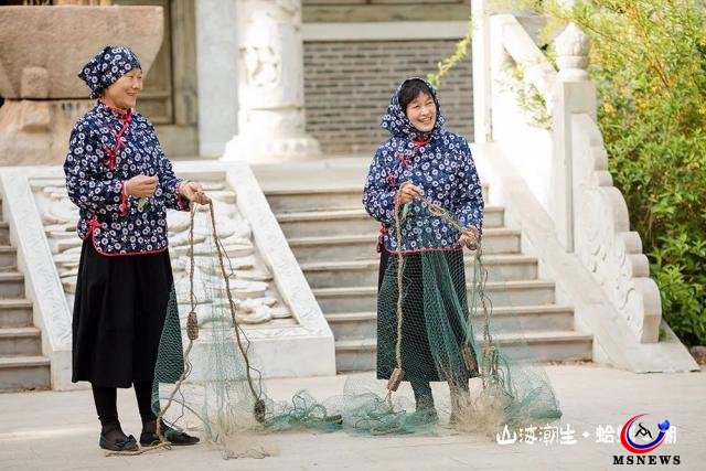 韓家民俗村的兩位非遺傳承人為游客展示紅島非物質(zhì)文化遺產(chǎn)項目漁網(wǎng)編制技藝。